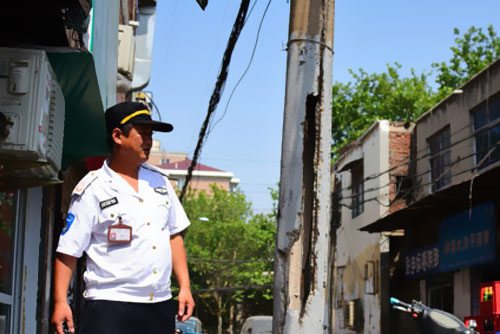 这根电线杆因何而开裂呢?巡查到此的未来路大街巡防队员张根生说出了原委。